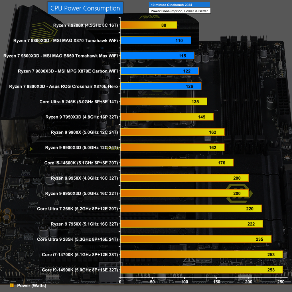 When we look at CPU power draw in Cinebench 2024 we see a surprising amount of separation where we might expect to see identical figures. In all four instances the CPU is running at 5.22 to 5.25GHz however the MSI X870 Tomahawk only requires 110W, The MSI B850 Tomahawk takes 115W, the MSI Carbon WiFi uses 122W and the Asus ROG Crosshair uses 126W.