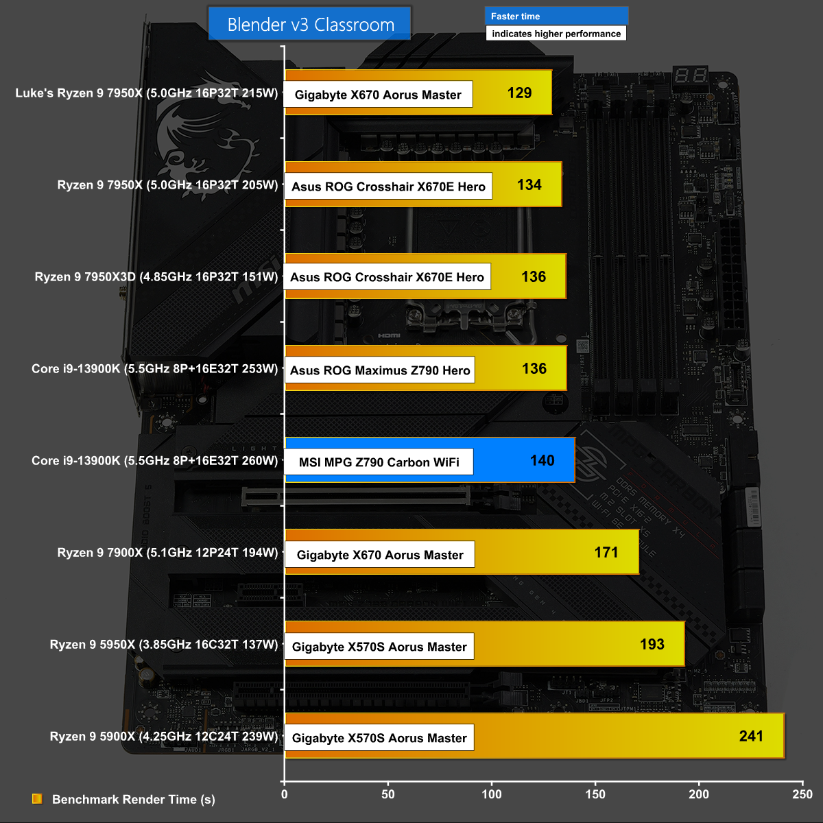 Blender v3 Classroom favoured our AMD CPUs over Intel however the difference between the fastest Ryzen 9 795X and our Core i9-13900K is relatively slender.
