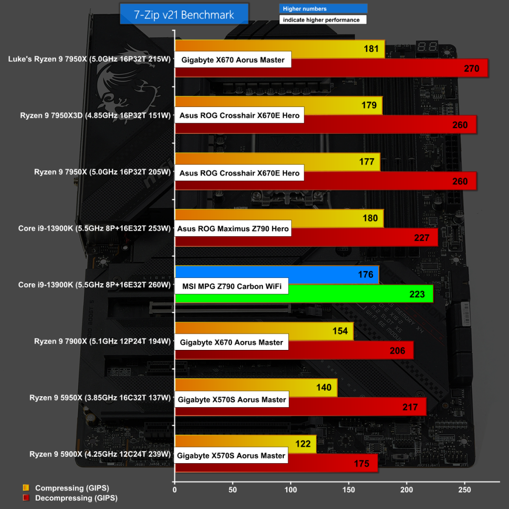 7-Zip v21 also shows the MSI MPG Z790 Carbon WiFi in a decent light. Performance is good and the numbers are in line with the competition.