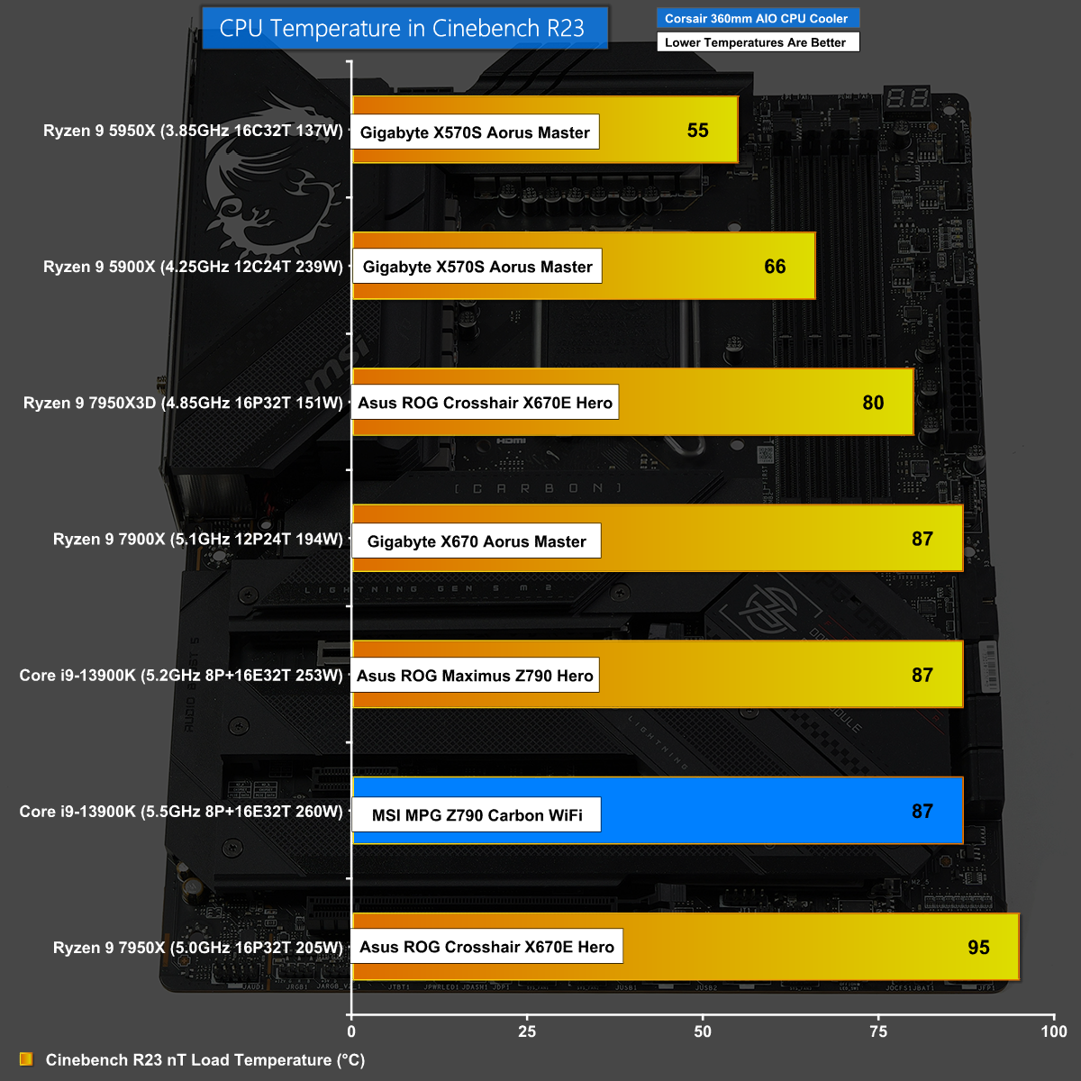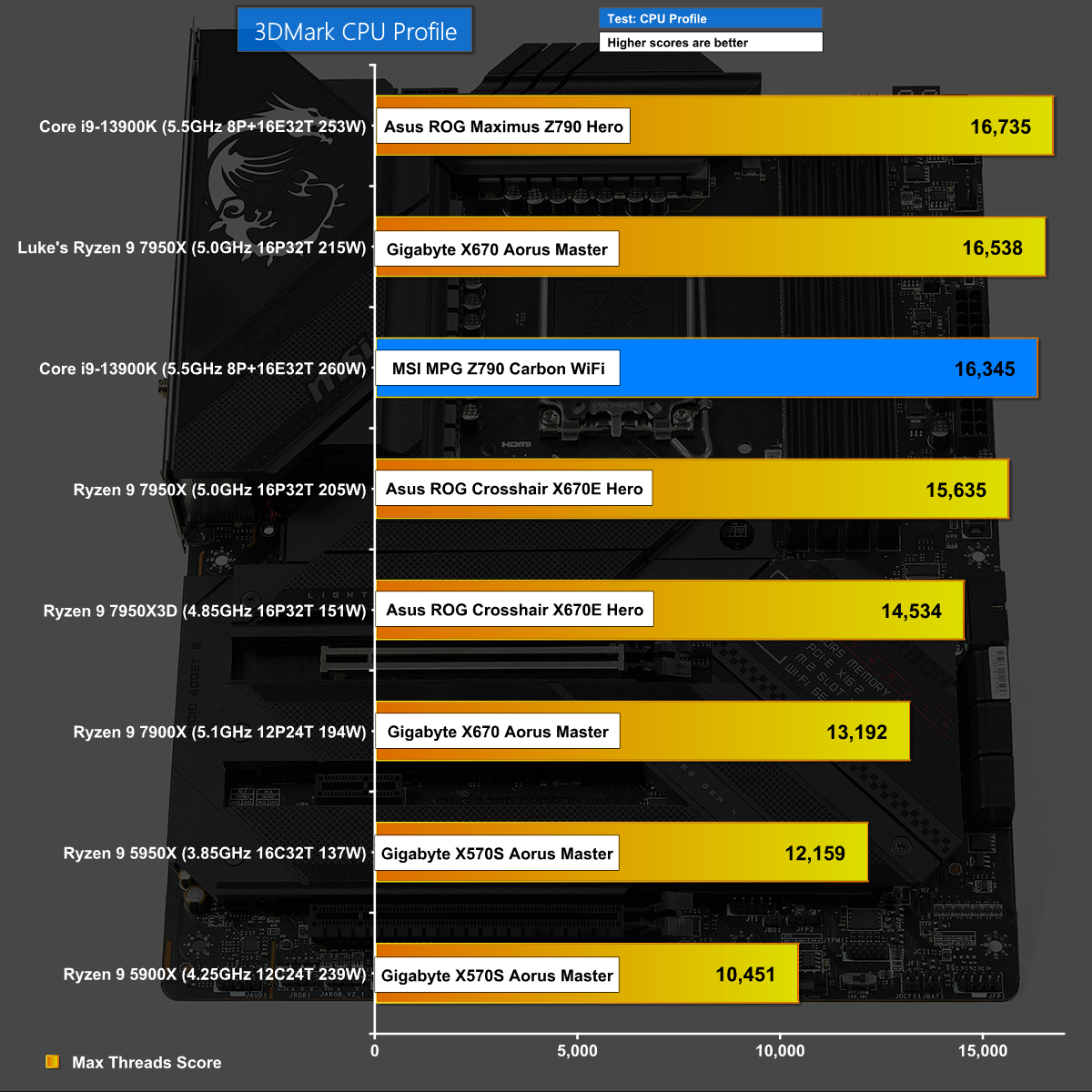 We see a familiar picture in 3D Mark CPU Profile where the MSI MPG Z790 Carbon WiFi narrowly loses out to the Asus ROG Maximus Z790 Hero.