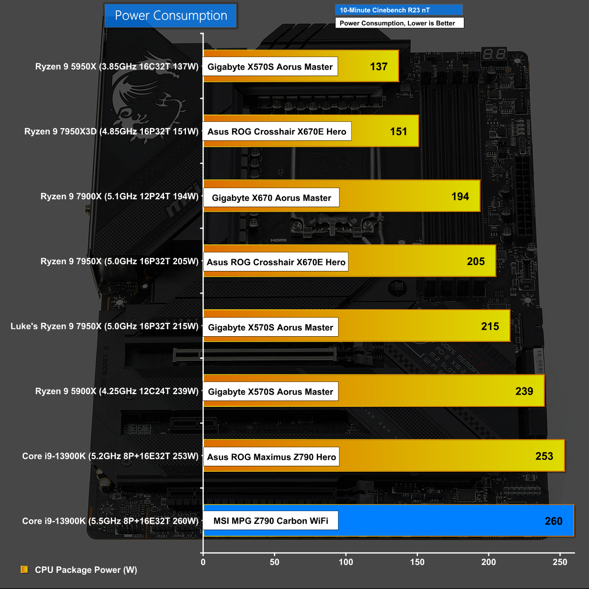 If you refer to our video you will see these Power Consumption figures are on manual settings and while the Core i9-13900K may look poor at 260W it looks positively awful on Auto settings where the power draw tops 300W.