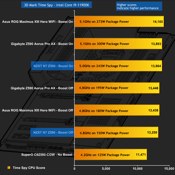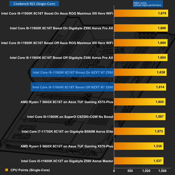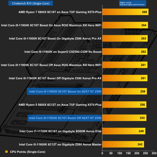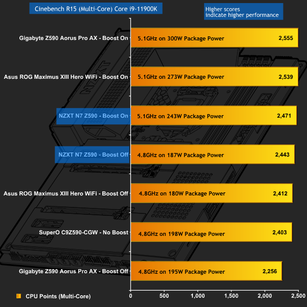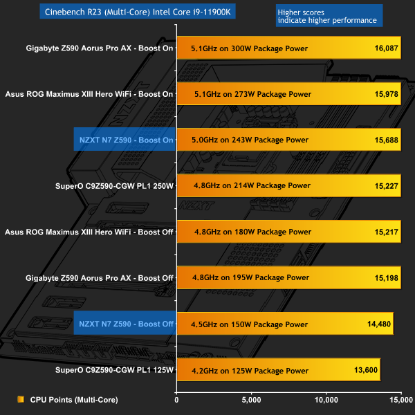 In these workloads the NZXT N7 Z590 behaves quite predictably. The power limits are relatively low, both with Adaptive Boost off and on, and as a consequence the clock speed of our Core i9-11900K is nothing special. It is easy to make the argument that this motherboard is better suited to a Core i7 or even a Core i5 however, as we discuss in our video, the Z590 chipset is uniquely suited to the Core i9 which is why we chose this combination for our testing.