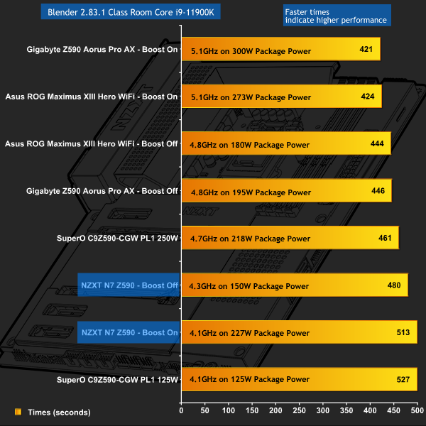 In Blender we see results that are entirely unexpected. Enabling Intel Adaptive Boost should increase clock speeds significantly, however in practice we see the opposite. This is clearly problematic, but the fact this lower performance is accompanied by raised Vcore and CPU power draw that goes up by 50 percent is little short of extraordinary.