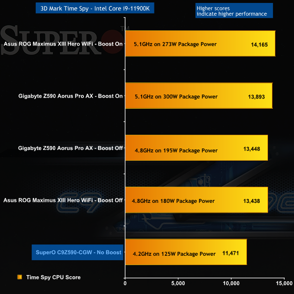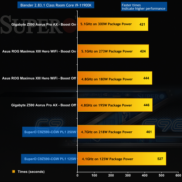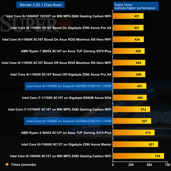 We can sum up the CPU benchmark results for 3D Mark and Blender quite easily as the Core i9-11900K is running at a low clock speed and as a consequence the SuperO sits a considerable distance down the charts.