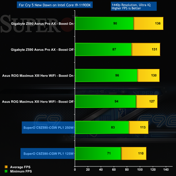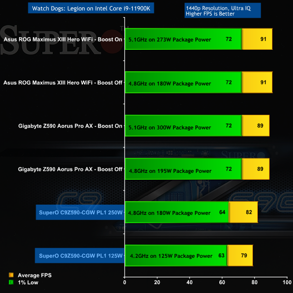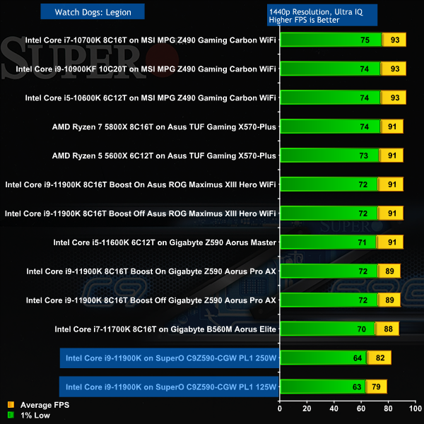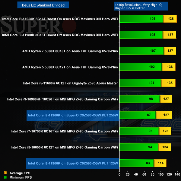 Our gaming test results on the SuperO C9Z590-CGW are little short of disastrous with a 10fps differential compared to the other motherboards. Whatever is going on feels more significant than a mere lack of clock speed and we have to hope that SuperO can unlock at least some of the missing performance with a BIOS update.