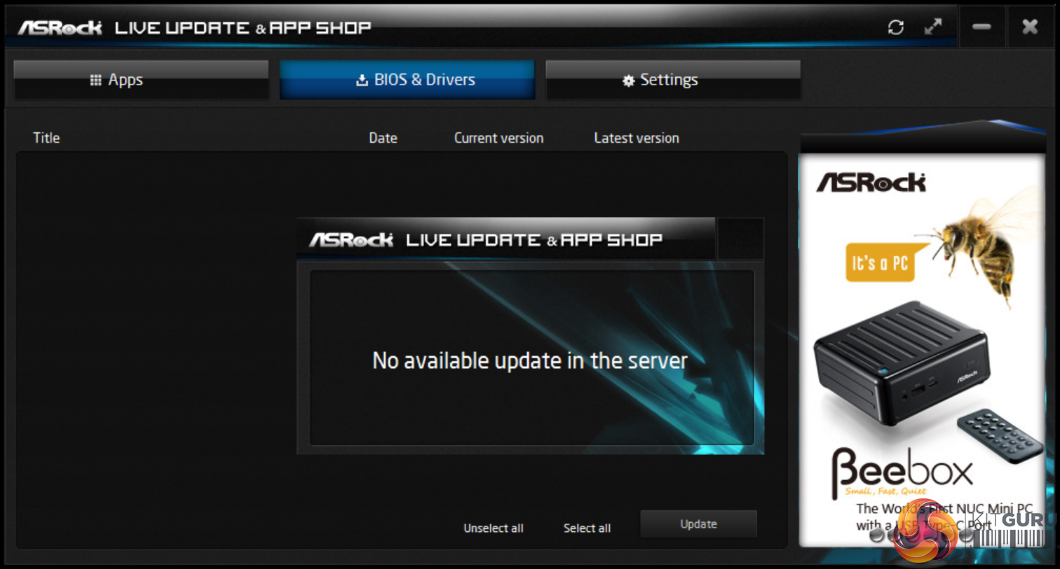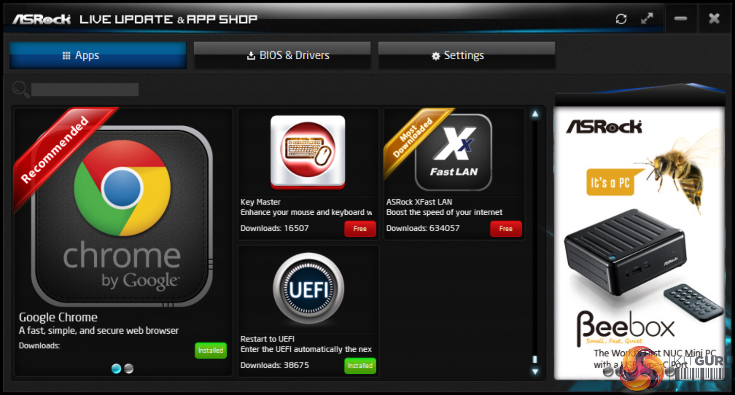 ASRock’s App Shop provides the dual role of serving out ASRock’s own software and approved third party software, but also includes a Live Update-style function which scans for certain BIOS and driver versions and informs the user when a newer version is available. It’s reasonably useful for both of its provided functions and isn’t too intrusive, but does pop up the occasional notification in Windows 10.