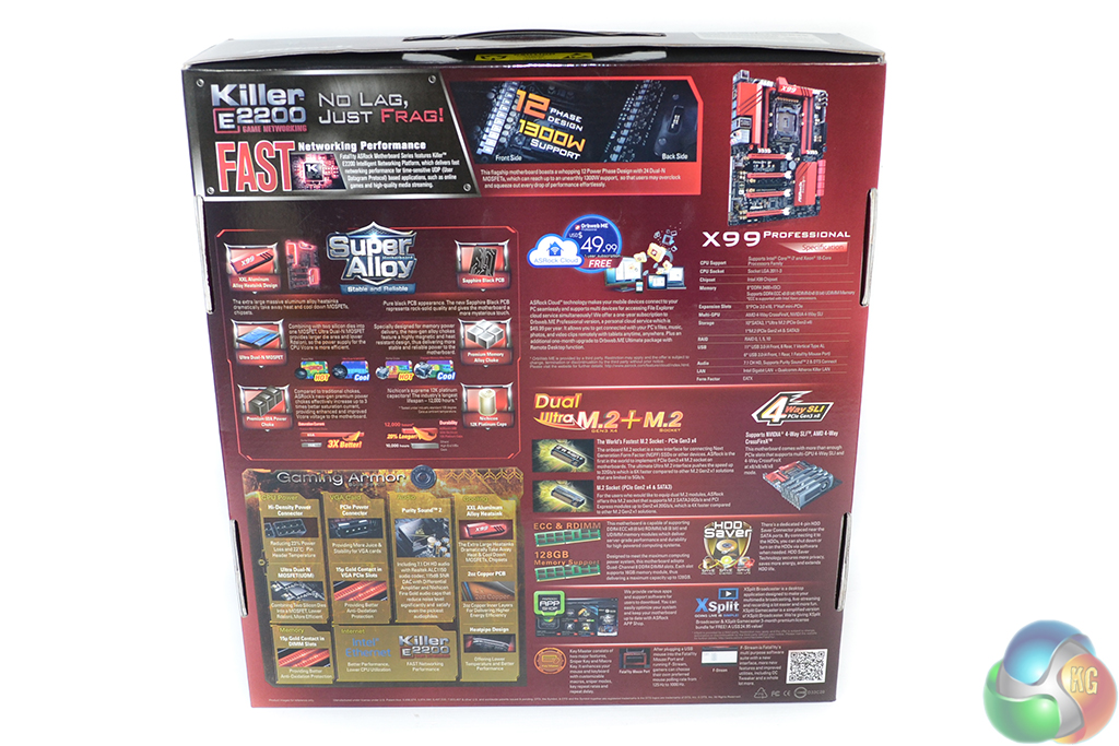 ASRock ships the X99 Professional in the company’s typical red and black Fatal1ty packaging. The front of the box outlines some of the key features, while a more detailed look at the specifications is found on the rear.