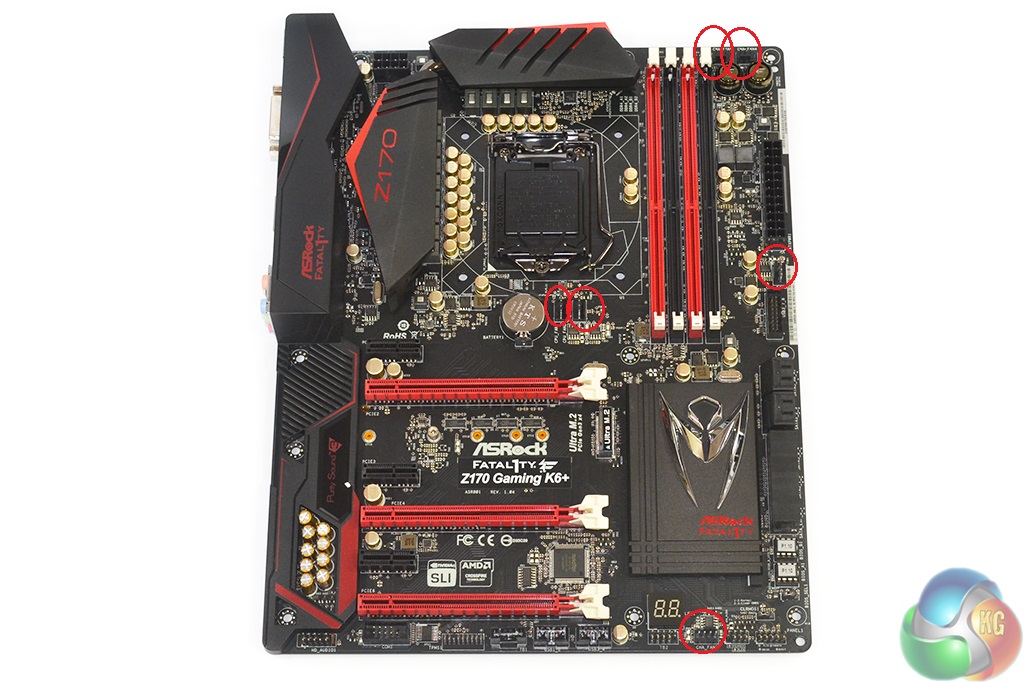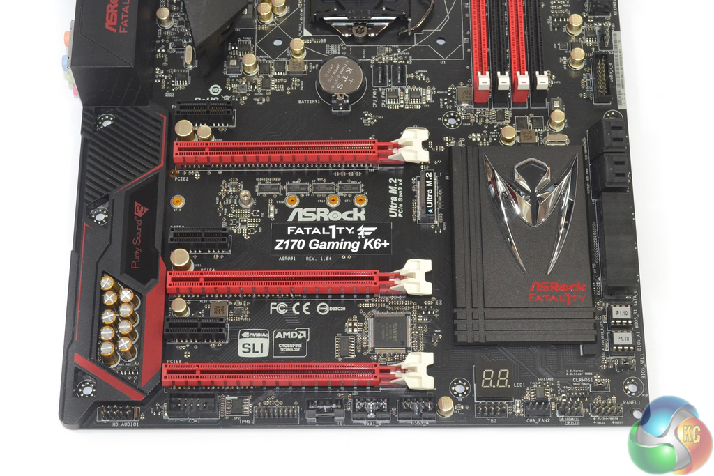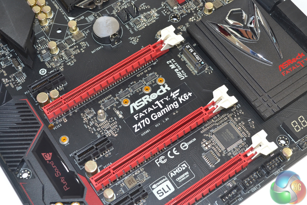Expansion slots for ASRock's Fatal1ty Z170 Gaming K6+ follow the typical design that we expect to see from an upper-mid-range, gaming-orientated Z170 motherboard. Two-card SLI and three-card CrossFire is supported. ASRock's slot spacing is as good as it gets for an ATX board with dual-card usage in mind, and placement of the Ultra M.2 slot allows an ugly green SSD to be hidden by the graphics card above, albeit while receiving extra heat.