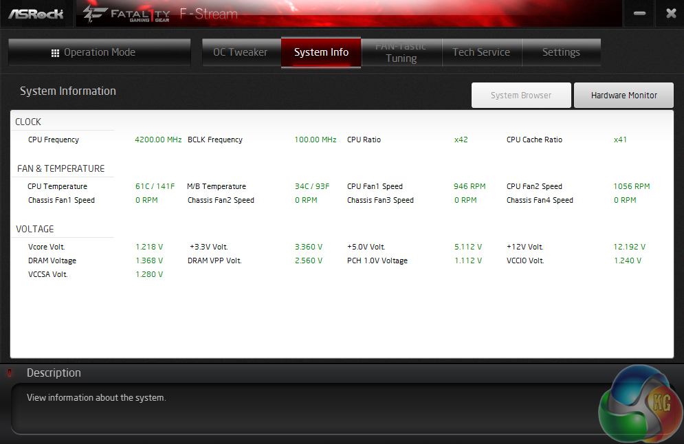 CPU-Z still has a voltage tracking issue with Skylake systems, so we called in assistance from ASRock's F-Stream software. Core voltage for the MCT settings hit a maximum of just below 1.22V under full load but dropped significantly whilst idling. This is the typical voltage level that we see applied to the mainstream platform Core i7 when MCT is enabled, and it should be simple enough to cool even with a modest cooler.