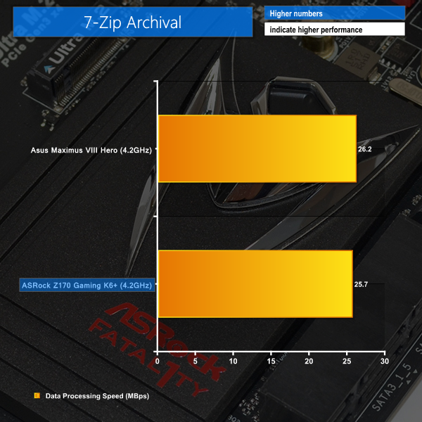 The 7-Zip archival test favours Asus' motherboard, however the difference in processing time was seen to be one second when looking at our raw test data.