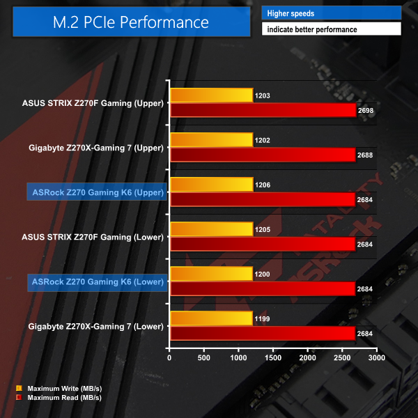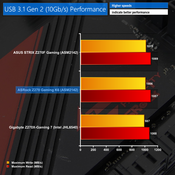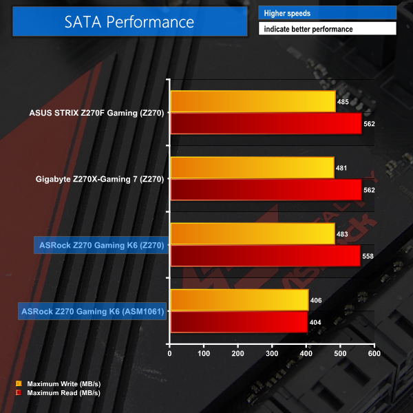 Speed from the Z270 SATA ports leaves no cause for concern. The ASM1061-powered ports are slow and should only be used for mechanical storage when no Z270 ports are available. I do, however, like ASRock's decision to include additional SATA ports; a pair of M.2 SSDs will steal bandwidth from a total of four Z270 SATA ports, leaving the ASM chipset as a good solution for extending the number of options for mass storage.