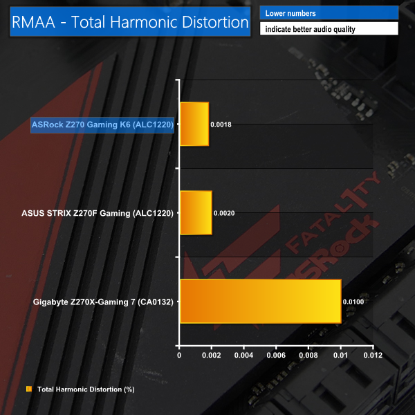 However, ASUS' STRIX Z270F Gaming uses the same ALC1220 codec but generally offers slightly better performance than ASRock's Z270 Gaming K6. This is likely due to the different strategy for audio capacitors and codec shielding.