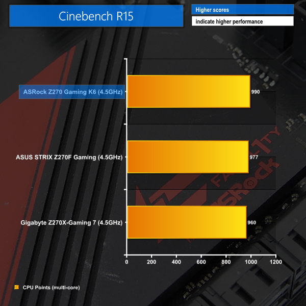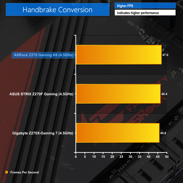 ASRock's Fatal1ty Z270 Gaming K6 makes an excellent start in the CPU-related performance benchmarks. Top place is taken in all three of the tests and the gap in Cinebench performance is not insignificant (plus it's consistent after being confirmed by many repeated runs).