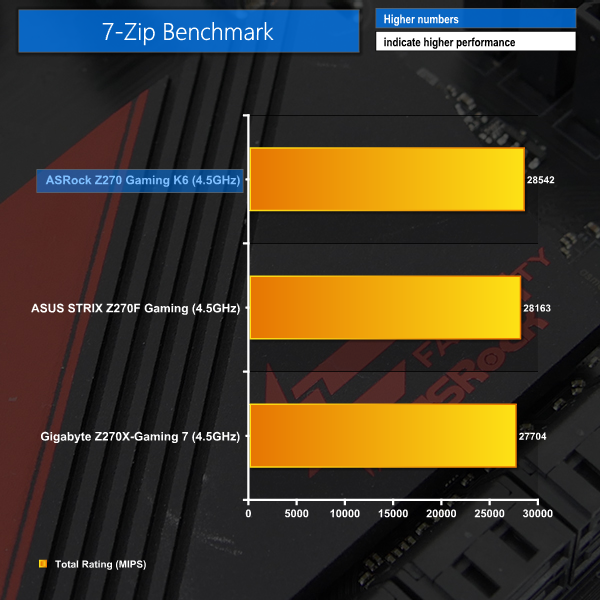 A good memory bandwidth result leads to a positive outcome for the 7-Zip benchmark. ASRock looks to have a good performance profile with the pre-release BIOS that we used for testing.