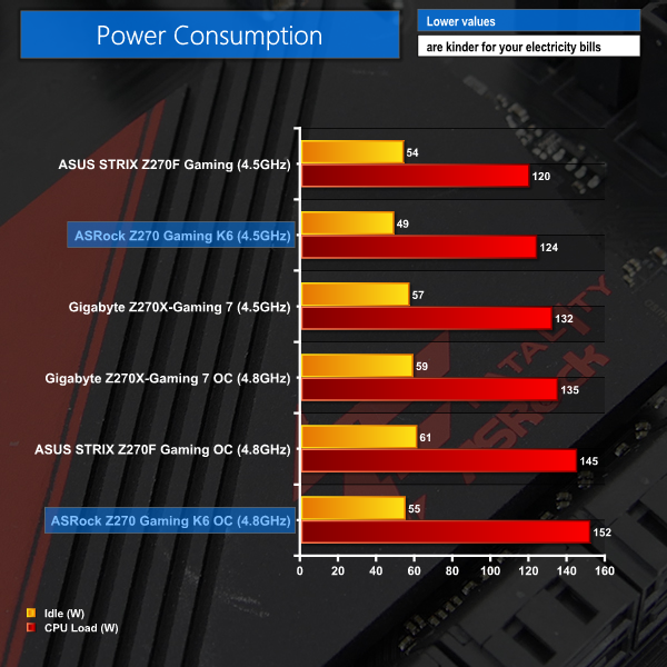 The 1.232V Stock MCT VCore results in positive power draw numbers for ASRock. A load system-wide power draw of 124W shows good efficiency and is only bested by ASUS' STRIX Z270F Gaming. Idle numbers are also positive thanks to the ability of ASRock's hybrid digital controller to drop the CPU core voltage under low-load conditions.