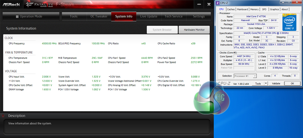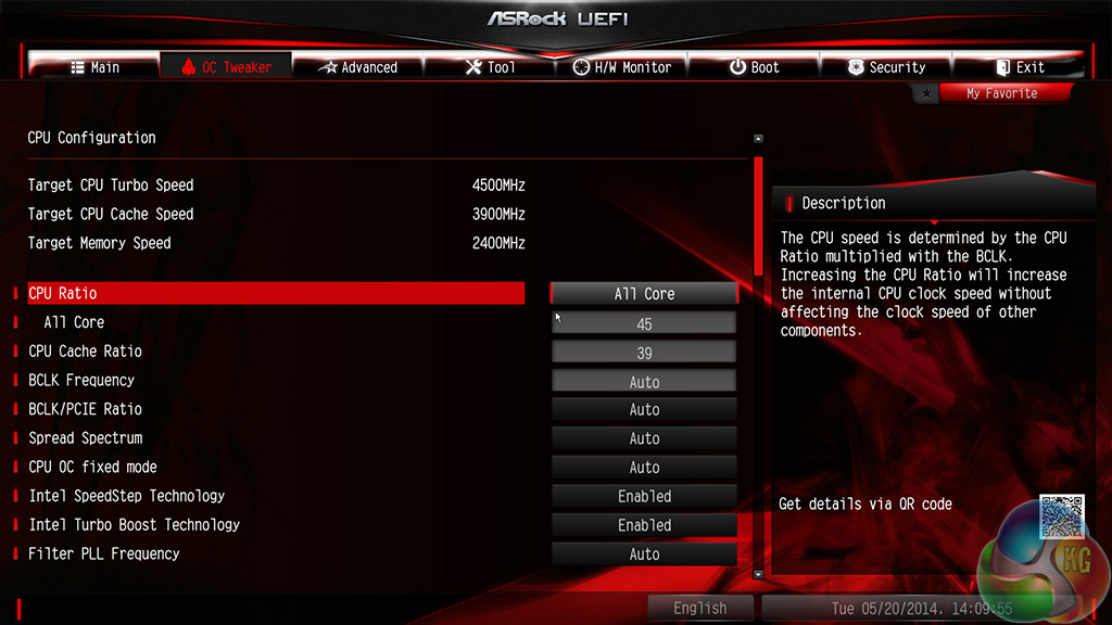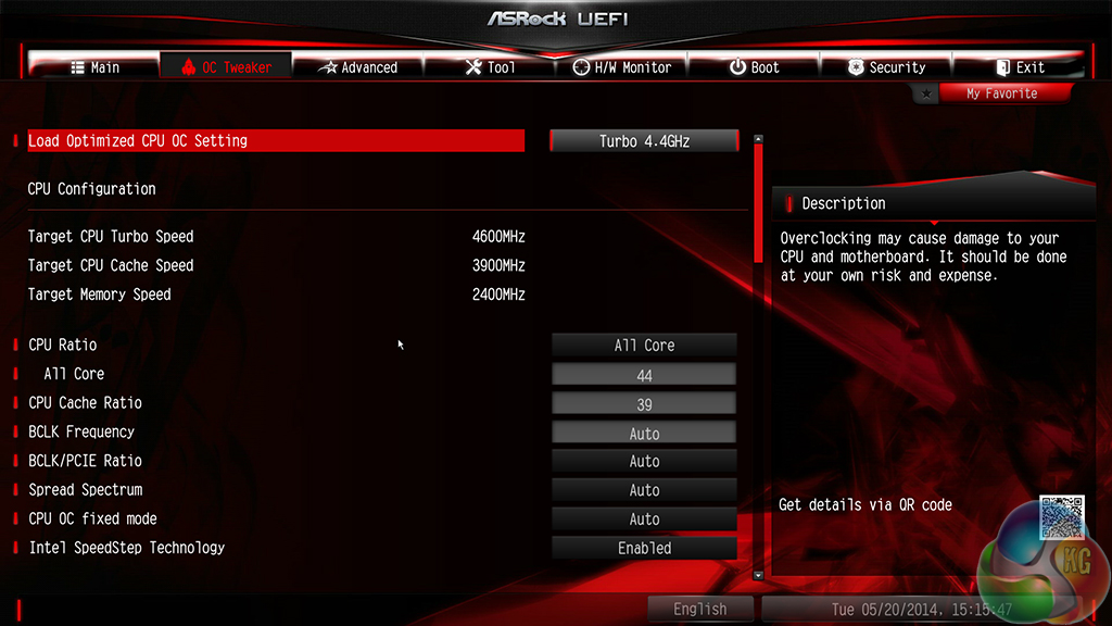 To test the ASRock Z97X Killer motherboard’s CPU overclocking potential, we first increased the CPU VCore to 1.325V, Cache voltage to 1.275V, and CPU Input Voltage to 1.900V. The CPU Cache ratio was set to 39x and LLC was set to ‘Enabled’.
