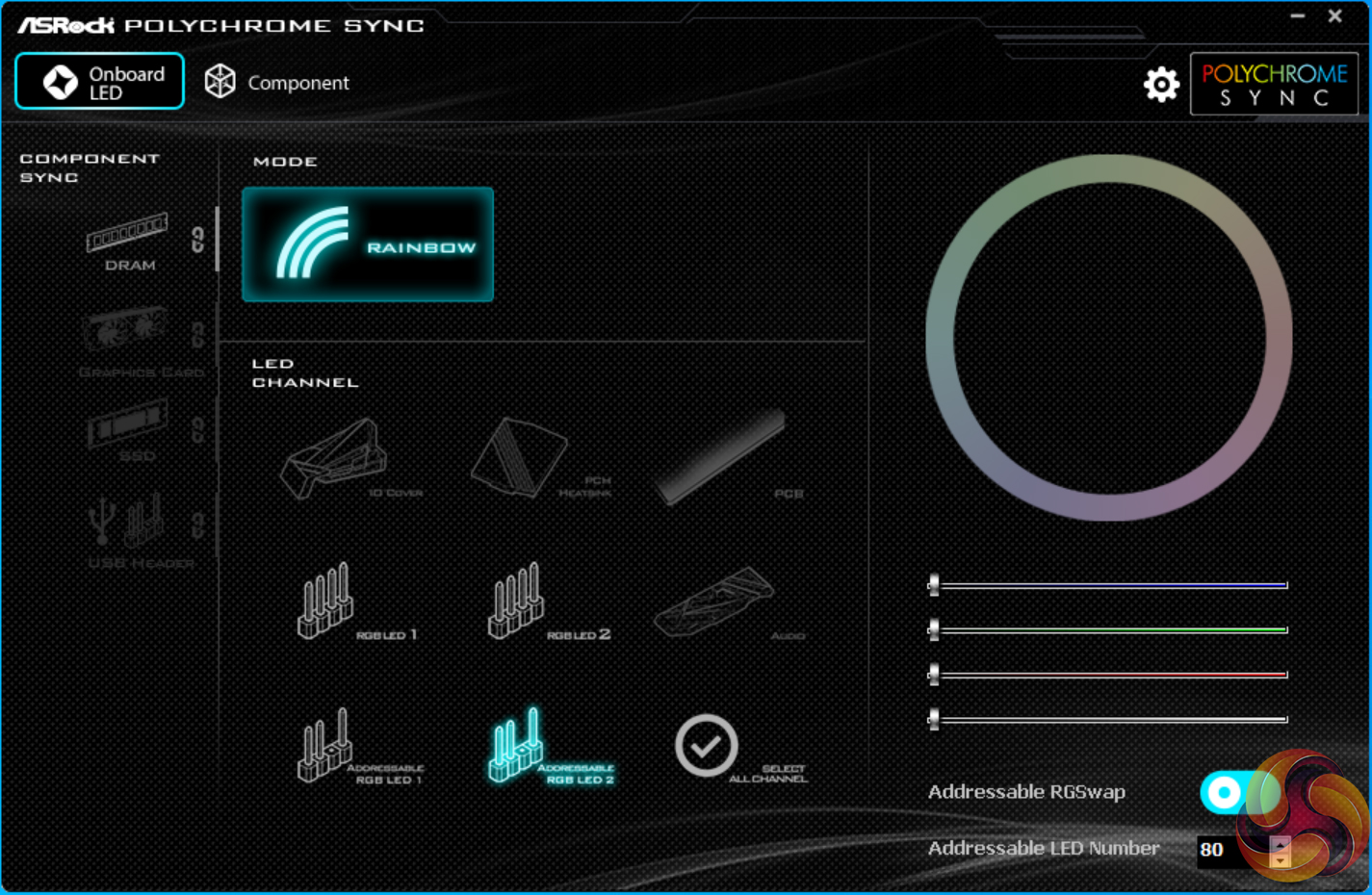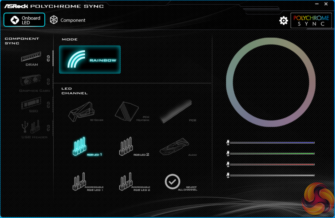 ASRock's primary OS software offering is Polychrome Sync RGB. This tool allows users to control RGB lighting through their motherboard and it worked well in our testing. There are options for different lighting modes, colours, and speeds.