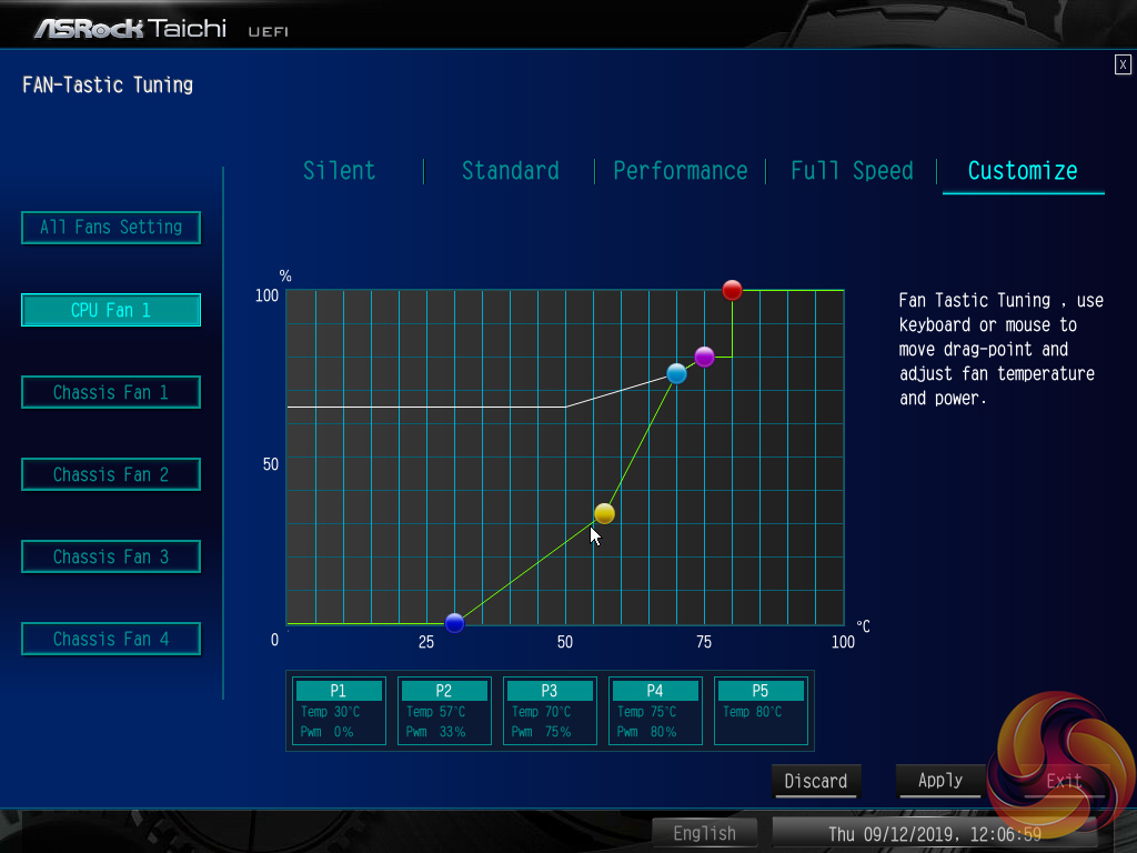 ASRock’s FanTuning utility automatically detects a number of minimum fan speed levels for the connected units. This can be useful when optimising fan speed curves to output as little noise as possible, while ensuring that the fans still rotate. The FAN-Tastic Tuning utility provides a graphical approach for managing fan speeds that is well built. The 5-point curve can be set to run fan speed levels as low as 0% at 30°C and the adjusted parameters update on connected fans in real time, which is ideal for tuning the system to one’s own preference.