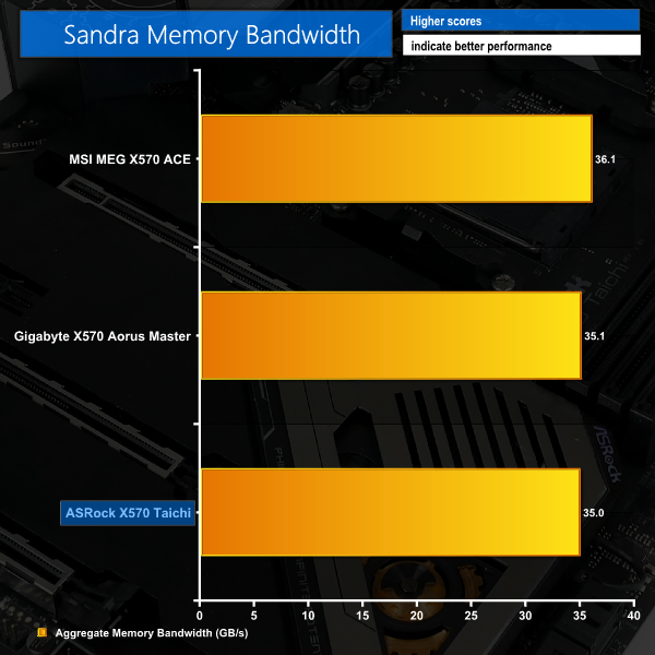 ASRock continues to show memory performance similar to Gigabyte with the 35GBps result in SiSoft Sandra.