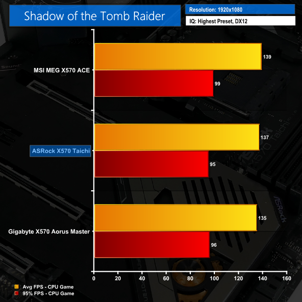 Shadow of the Tomb Raider shows another solid gaming result for the X570 Taichi with its average performance sitting between Gigabyte and MSI. With that said, frame consistency wasn’t quite as good as the two competitors, with the 95% FPS number from ASRock’s board scoring a little lower throughout our testing. The difference is minuscule, however.