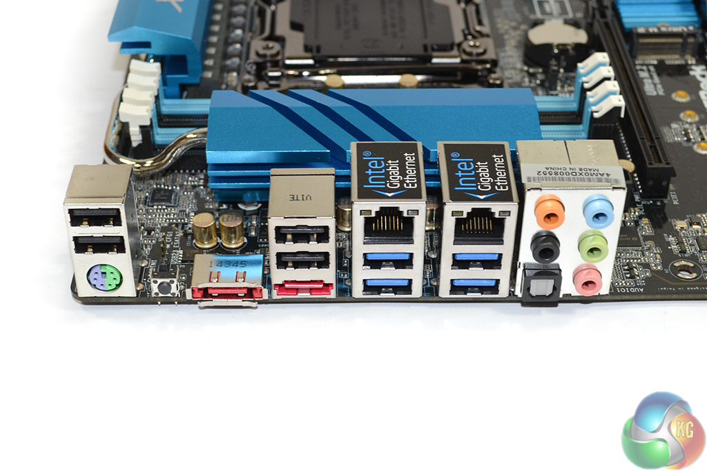Two eSATA connectors, in addition to four USB 3.0 ports (two of which operate from an ASMedia ASM1042AE PCIe 2.0 x2 host controller), continue the motherboard's storage theme. Intel I218-V and I211-AT Gigabit Ethernet NICs are used and can be teamed together.