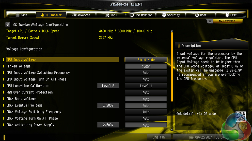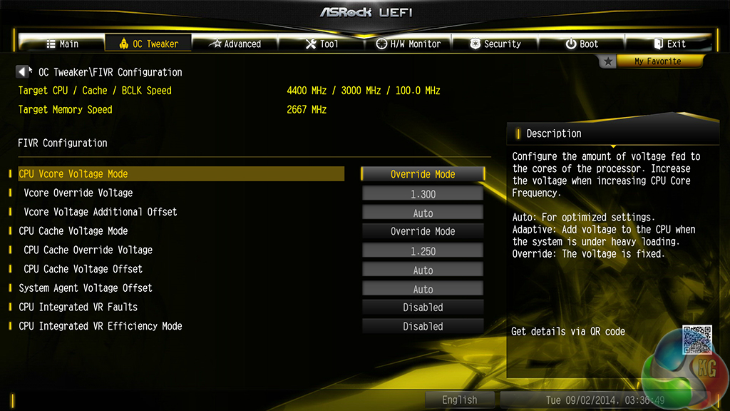 To test the ASRock X99 OC Formula motherboard’s CPU overclocking potential, we first increased the CPU VCore to 1.30V, Cache voltage to 1.25V, and CPU Input Voltage to 2.00V. We also disabled the FIVR power control setting, selected the High BCLK PLL mode, and applied level 1 LLC.