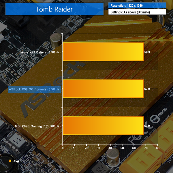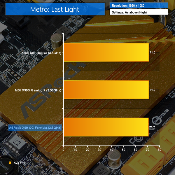 Gaming performance is very similar between each of the motherboards, irrelevant of the CPU and memory frequencies. ASRock's X99 OC Formula is one-tenth of a frame off top spot in the Tomb Raider and Bioshock Infinite tests. The board does, however, drop by a third of a frame in the Metro: Last Light benchmark.