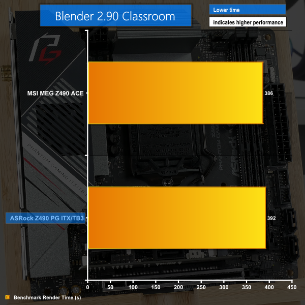 Focussing on temperatures from the motherboard hardware highlights some notable concerns. ASRock’s stock voltage and power settings for the motherboard with the 10900K and latest BIOS are very aggressive. We registered a wall system power draw of close to 400W under Cinebench and Blender workloads at stock XMP settings.