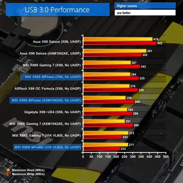 We tested USB 3.0 performance using the Kingston HyperX 3K SSD connected to a SATA 6Gb/s to USB 3.0 adapter powered by an ASMedia ASM1053 controller.