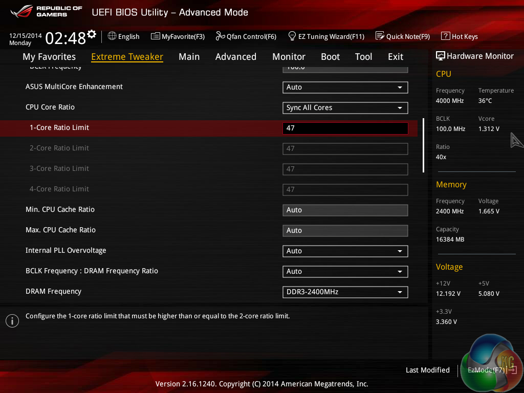 For the initial manual overclocking tests, we applied our typical range of CPU, cache, and input voltage levels. The Maximus VII Impact responded very badly to our settings, refusing to boot at more than 100MHz past the 4790K's 4.4GHz MCT frequency.
