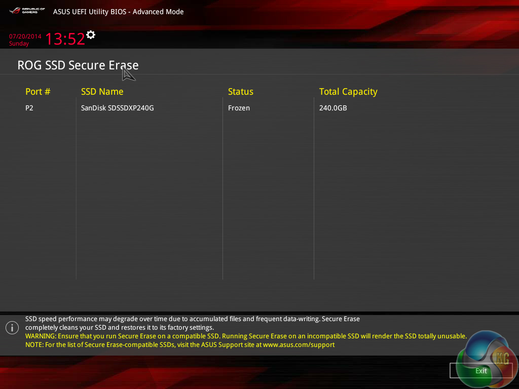 Asus' usual set of tools is supplied in the ROG UEFI, as well as the convenient Secure Erase. Users can route through a drive to look for a BIOS update file and update to eight settings profiles can be saved.