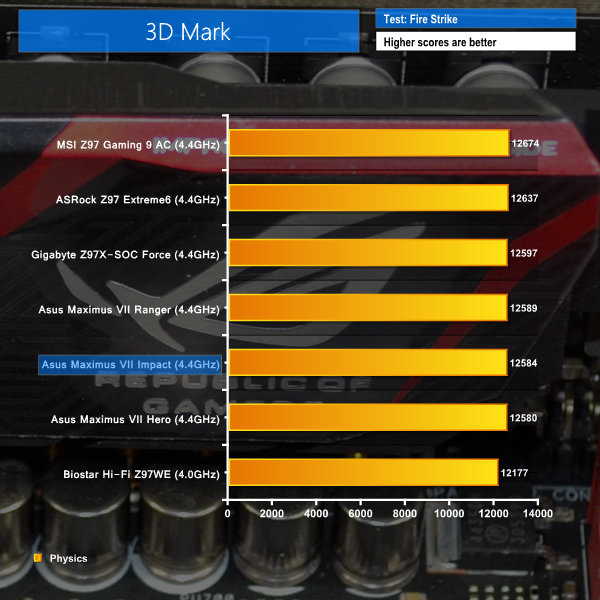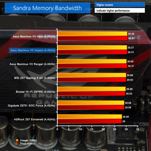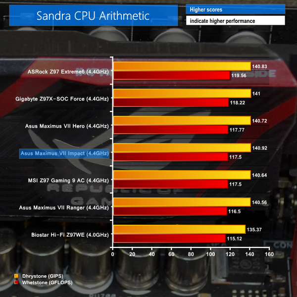 The Maximus VII Impact does not shy away from competition against the ATX competitors. Solid performance keeps the mITX part competitive in the 3DMark Physics and Sandra processor arithmetic tests.
