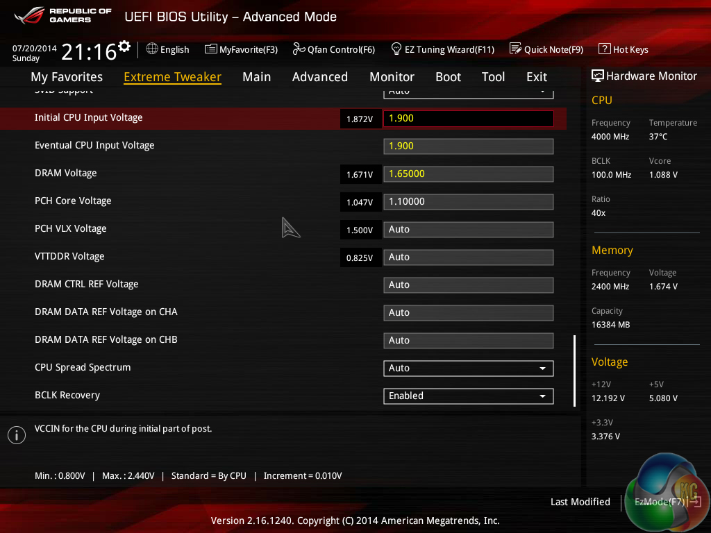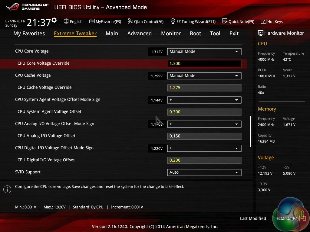 To test the ROG motherboards' CPU overclocking potential, we first increased the CPU VCore to 1.30V, Cache voltage to 1.275V, CPU Input Voltage to 1.900V, and PCH voltage to 1.10V. We also applied enabled PLL overvoltage and set the cache ratio to 40x.