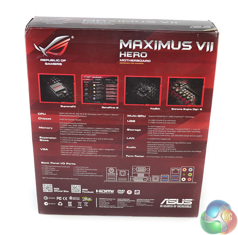 The Maximus VII Hero is also supplied in bold red packaging. Specifications and features are highlighted on the rear of the box.