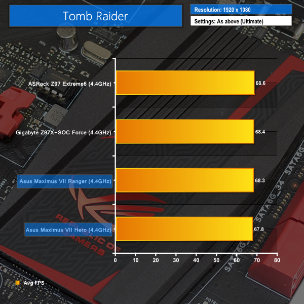 Tomb Raider performance is slightly slower on both Asus boards than the Gigabyte and ASRock competitors.