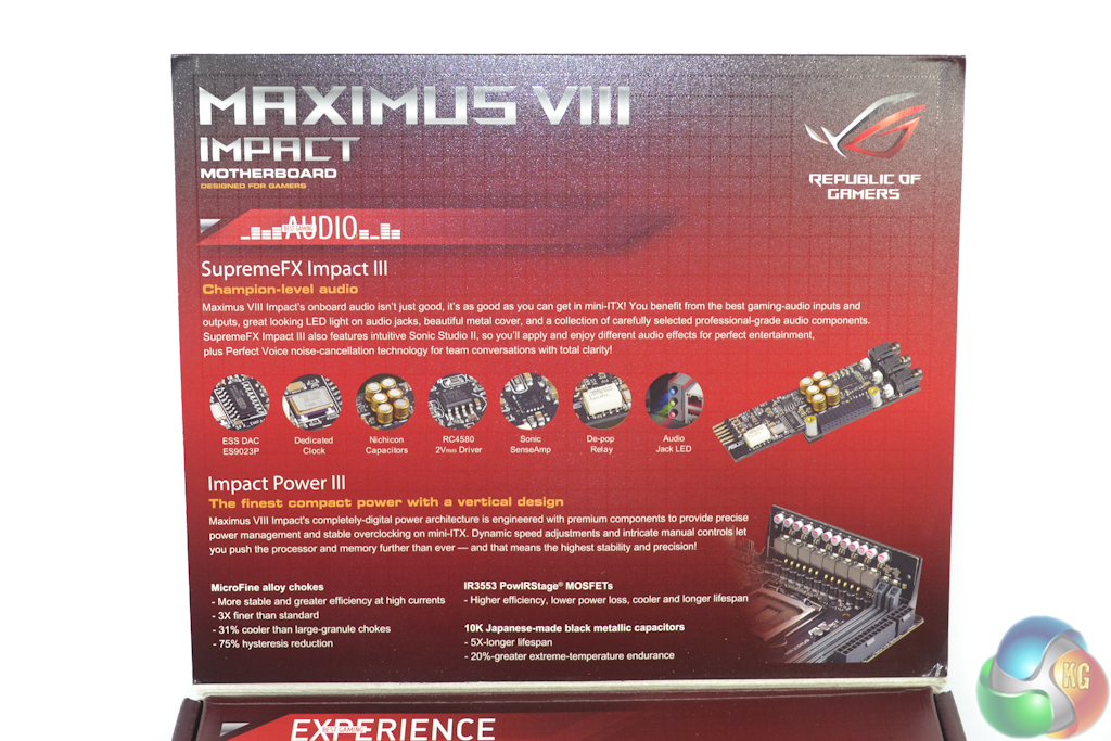The Asus Maximus VIII Impact ships in a box with typical ROG styling. A basic handful of features is found on the front of the box, with the more in-depth specifications residing on the rear.