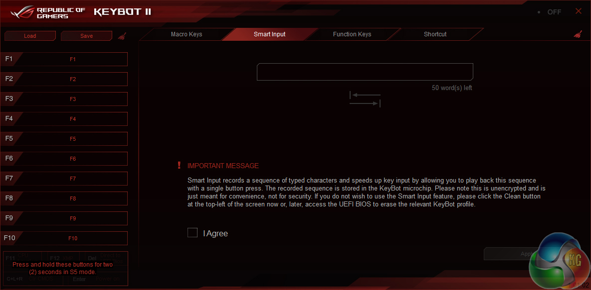 KeyBot can be used to program macros, assign shortcuts to certain keys, and even type specific phrases. And when the system is shut down, specific keys can be used for applying an overclock, launching into the UEFI, and booting into Windows.