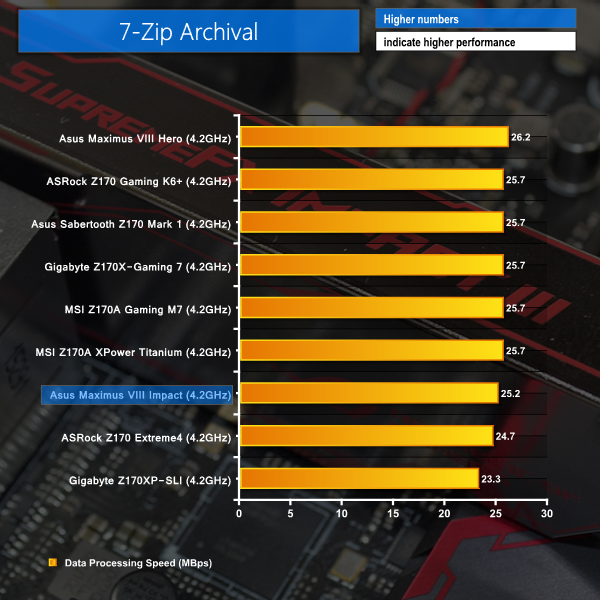 7-Zip performance is little below the typical numbers displayed by competitors. This is likely related to the reduced memory capacity and number of DIMMs that the Maximus VIII Impact was forced to use.