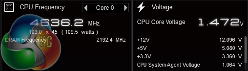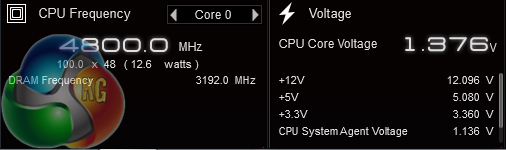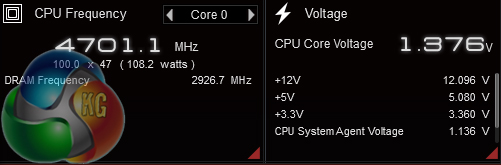 Under full Prime95 load, the chip was supplied with 1.376V for its 4.7GHz frequency. This is a surprisingly well-tuned overclock that required zero user input and resulted in stability and decent CPU temperatures.