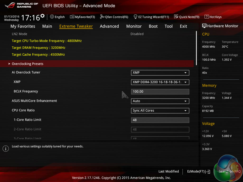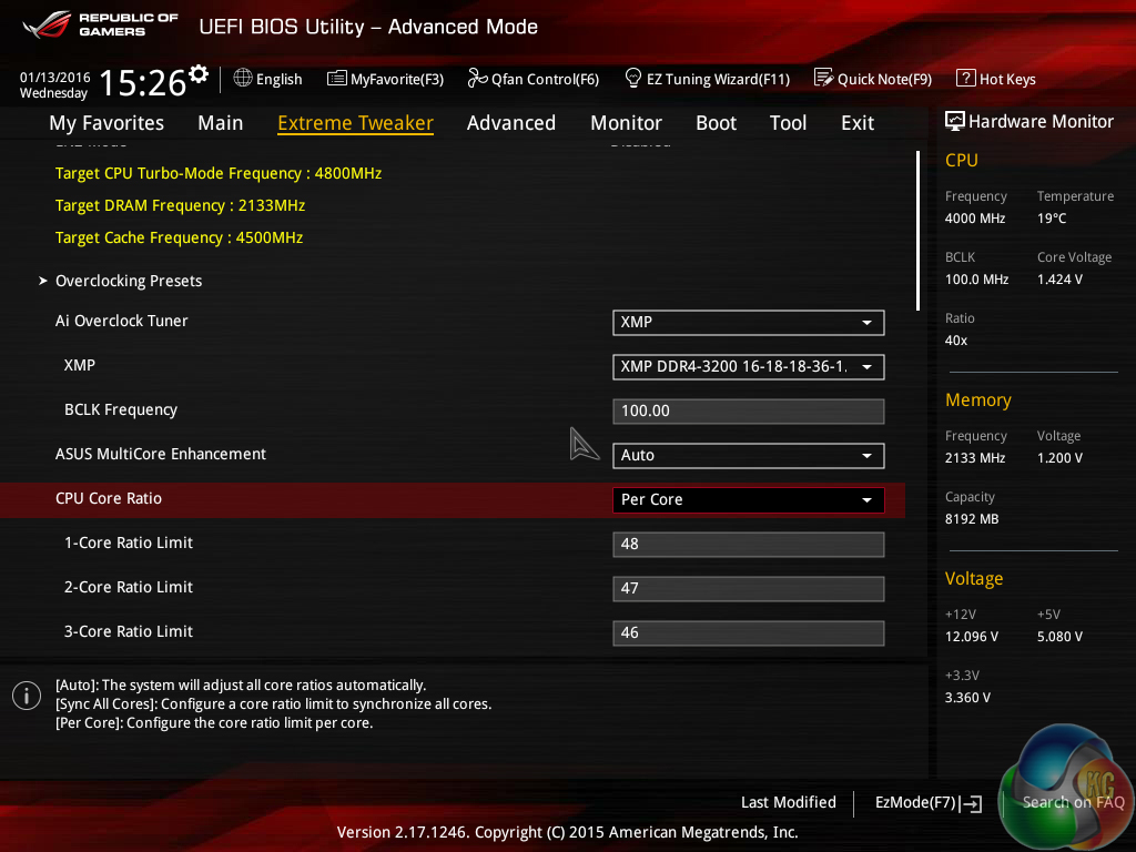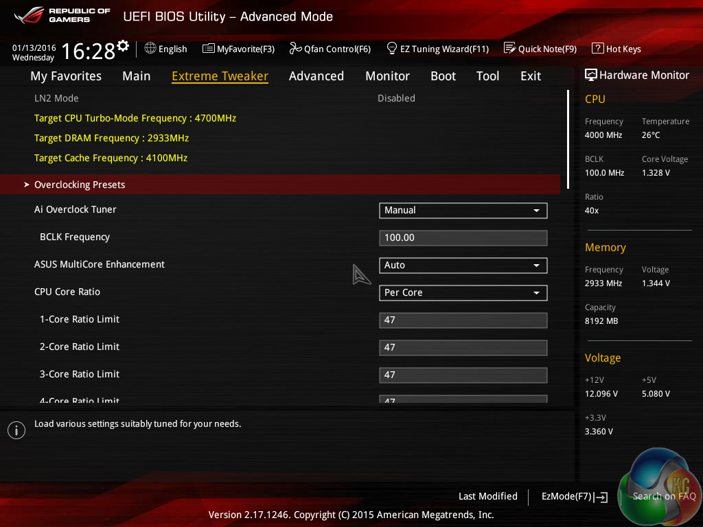 We selected the usage option as gaming and the cooling option as watercooling (as this releases Asus' highest performance tuning, and our Noctua NH-D14 is a capable unit). The system applied a 435MHz boost in CPU frequency by way of a multiplier bump to 45x and a 103MHz BCLK.