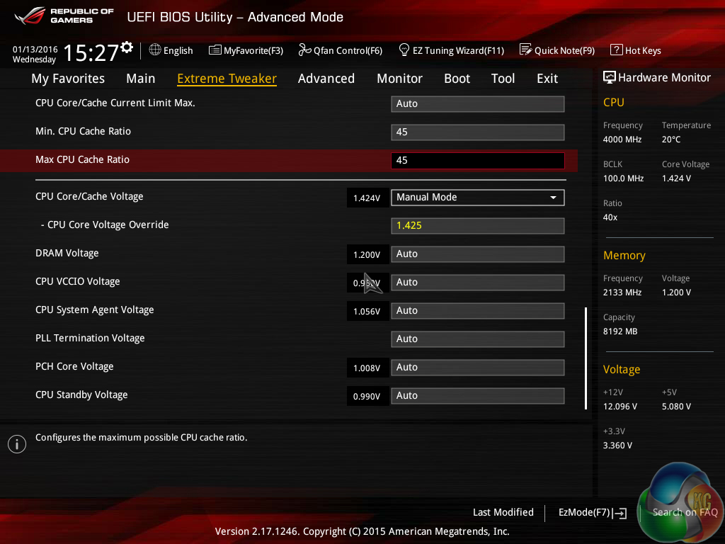 To test the Asus Maximus VIII Impact motherboard’s CPU overclocking potential, we first increased the CPU VCore to 1.40V and the PCH voltage to 1.10V. We selected Level 5 load-line calibration after trial and error showed that it delivered an acceptable load voltage level that remained below our target VCore. Power saving settings were disabled and the CPU Cache ratio was set to 45x.