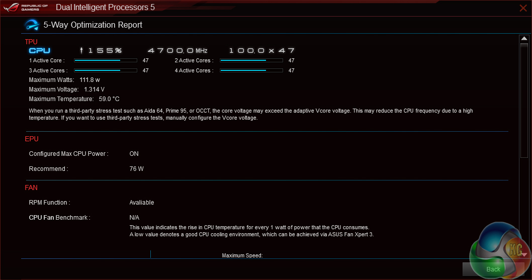 Asus' software also displays the highest CPU multiplier that was tested and the highest one to be found stable. This could prove useful as a reference point for those trying to push their PC to the limit.