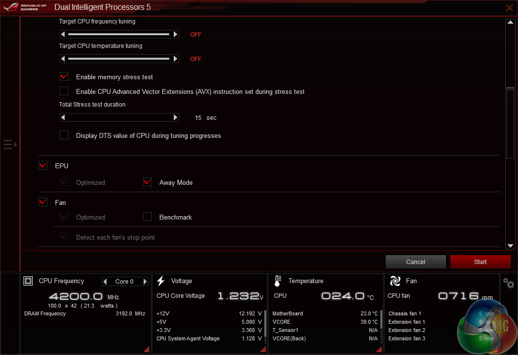 The OS-based 5-Way Optimisation tool found in Asus' AI Suite software allows a number of parameters to be set before overclocking tuning begins. Asus gives users plenty of flexibility for the system to be tuned to a clock speed that is deemed stable for their usage scenarios.