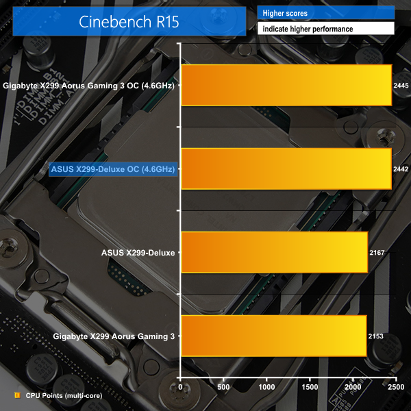 As a performance comparison, we have included the results from the Gigabyte X299 Aorus Gaming 3. The maximum overclocked configuration achieved with each board was a 4600MHz (46 x 100MHz) processor frequency whilst using 3200MHz CL14 memory.