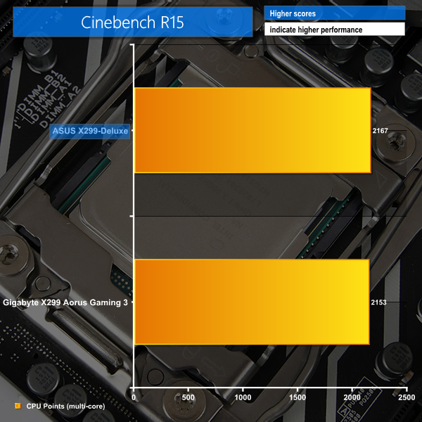 CPU-driven performance for ASUS' premium X299 board is strong. First place finishes are achieved in Cinebench and 7-Zip.