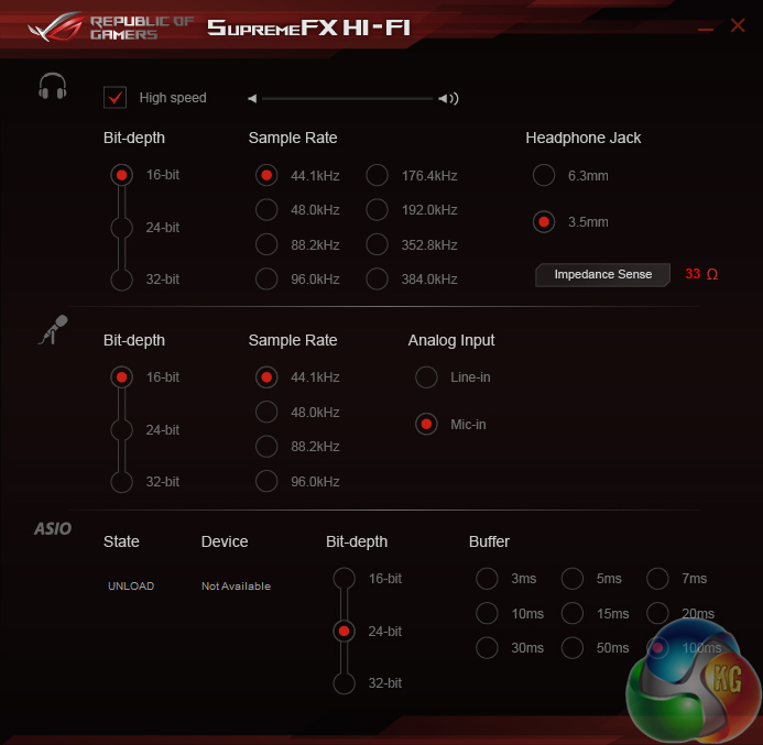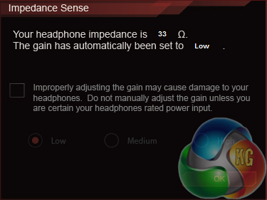 A number of settings and profiles relating to the audio system can be adjusted using Sonic Studio II and SupremeFX HiFi. The SupremeFX HiFi tool is also able to automatically detect the impedance of headphone connected to the external box and adjust the amplifier gain accordingly.