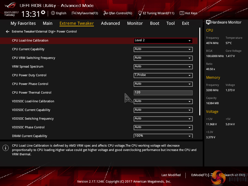 There is no visual or numerical interpretation of how the selected LLC setting will influence CPU VCore. We found Level 3 to provide a voltage far from our targetted level under load. Level 2 tended to deliver around 1.395-1.417V under Cinebench load and around 1.46V when idling. This was using a UEFI-set 1.40V for the CPU VCore. ASUS needs to provide better interpretation of how the LLC settings will influence CPU voltage.