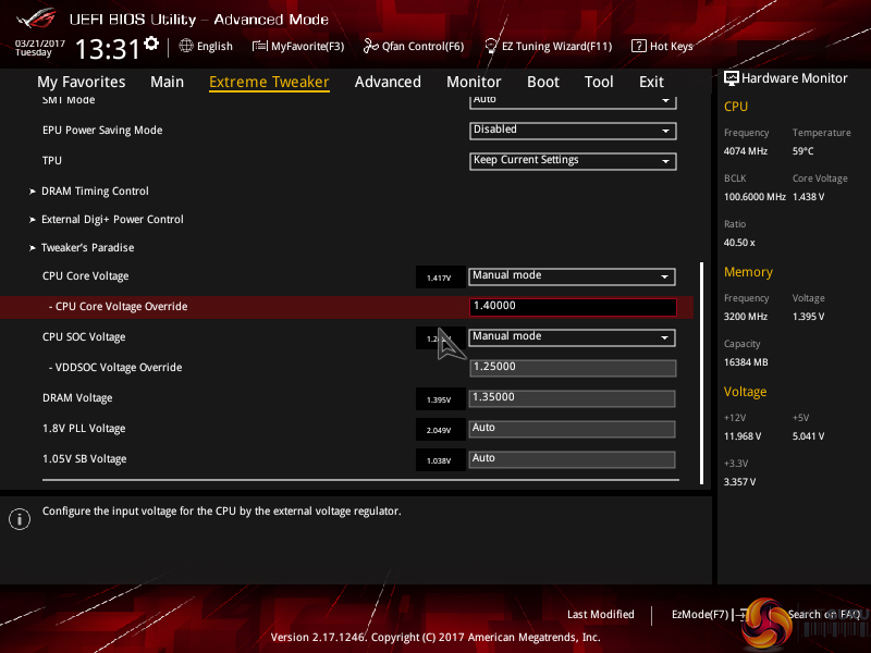 To test the ASUS ROG Crosshair VI Hero motherboard’s CPU overclocking potential, we aim to set the CPU voltage close to 1.40V. CPU VCore is set to 1.40V, SOC voltage is set to 1.25V, and we applied the Level 2 LLC setting.