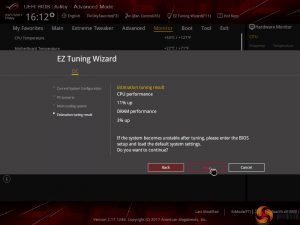 ASUS includes a handful of overclocking presets relating to BCLK, CPU, and memory speed adjustments. The EZ Tuning Wizard also has an ability to increase system speed for novice users but its headroom is limited due to the minimal overclocking potential of the higher-clocked Ryzen 7 1800X.