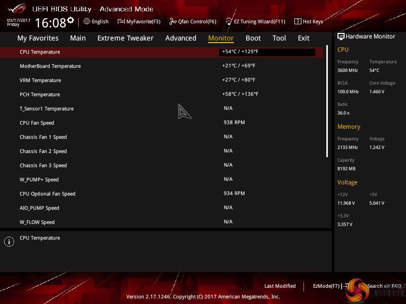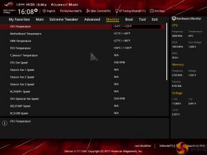 ASUS gives a wealth of information relating to voltages, temperatures, and fan speeds, as displayed in the Monitor UEFI page.